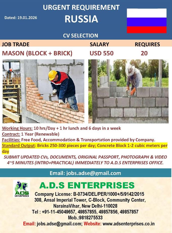 Required 20 No. of Mason for a reputed Russian Company urgently.